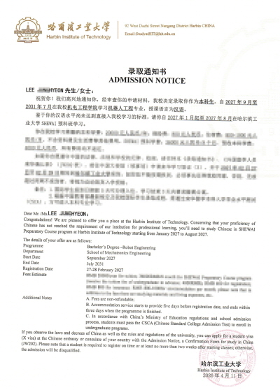 이O현 학생이 하얼빈공업대학교(本部) 로봇공학 전공에